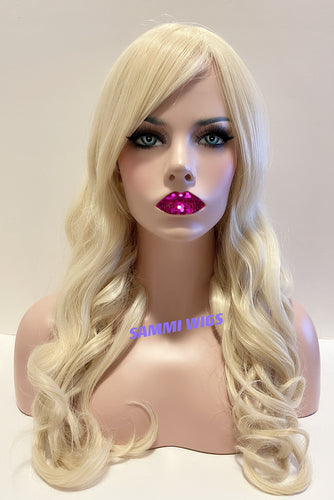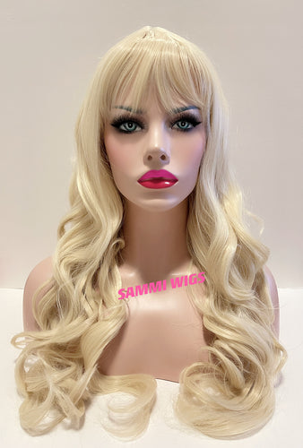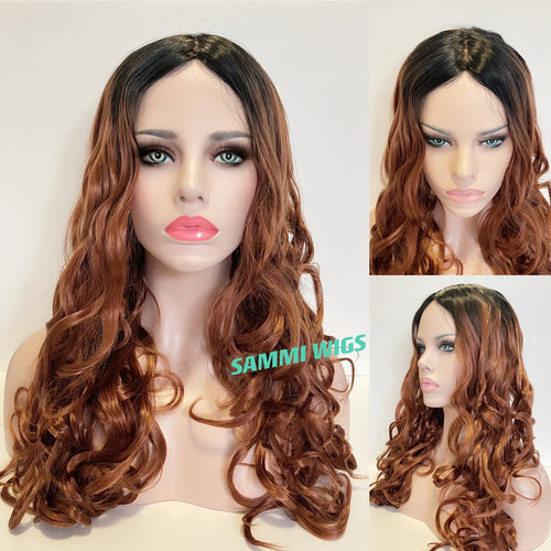 Extra long curly wig with hand made monofilament in parting section in ombré from black to warm dark blond color