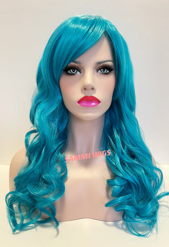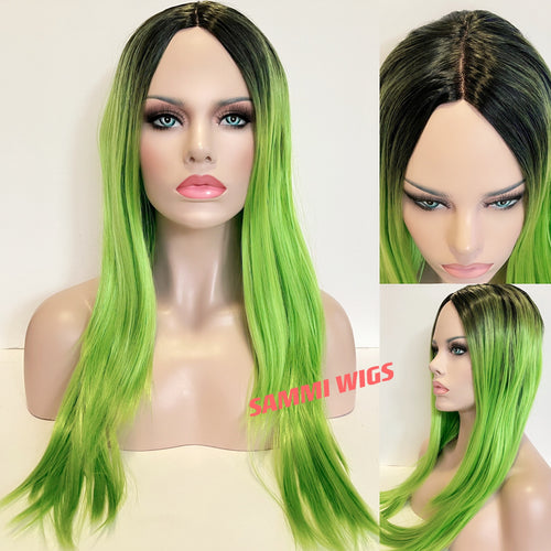 Hand made monofilament top in parting section ombré black to light green long wavy wig with layers