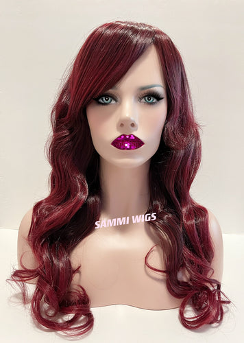 F708 Long thick curly wig in burgundy red mix with very dark brown color