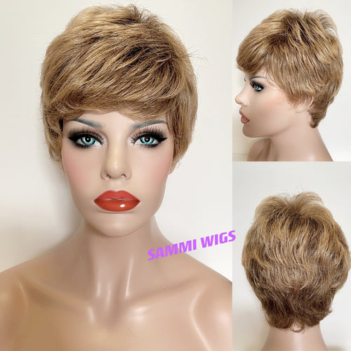 TW-27 Short tight curly wig in light brown with golden blond highlights